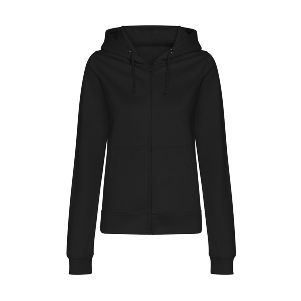 Sweat zippé sur toute la longueur. Coupe décontractée pour femme. Zip principal YKK en plastique recouvert. Ourlet à double surpiqûre. Capuche doublée. Cordons unis Poches kangourou. Une simple étiquette décollable facilite le changement de marque. Intérieur en molleton gratté. Poignets et ourlet côtelés. Une face en coton doux permet de créer une surface d'impression idéale. Certifications WRAP, Sedex et PETA APPROVED VEGAN.