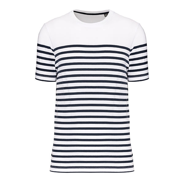 Coton peigné : durabilité du vêtement dans le temps Lavage aux enzymes : Matière douce et confortable. 100% coton. Ce t-shirt est conçu à partir de 100% de coton peigné biologique. Le certificat GOTS est délivré par Ecocert Greenlife. Coupe droite. Lavage aux enzymes. Encolure ronde avec bord-côte 1x1. Rayures tricotées. Bande de propreté au col. Finition double aiguille bas de manches et bas de vêtement.